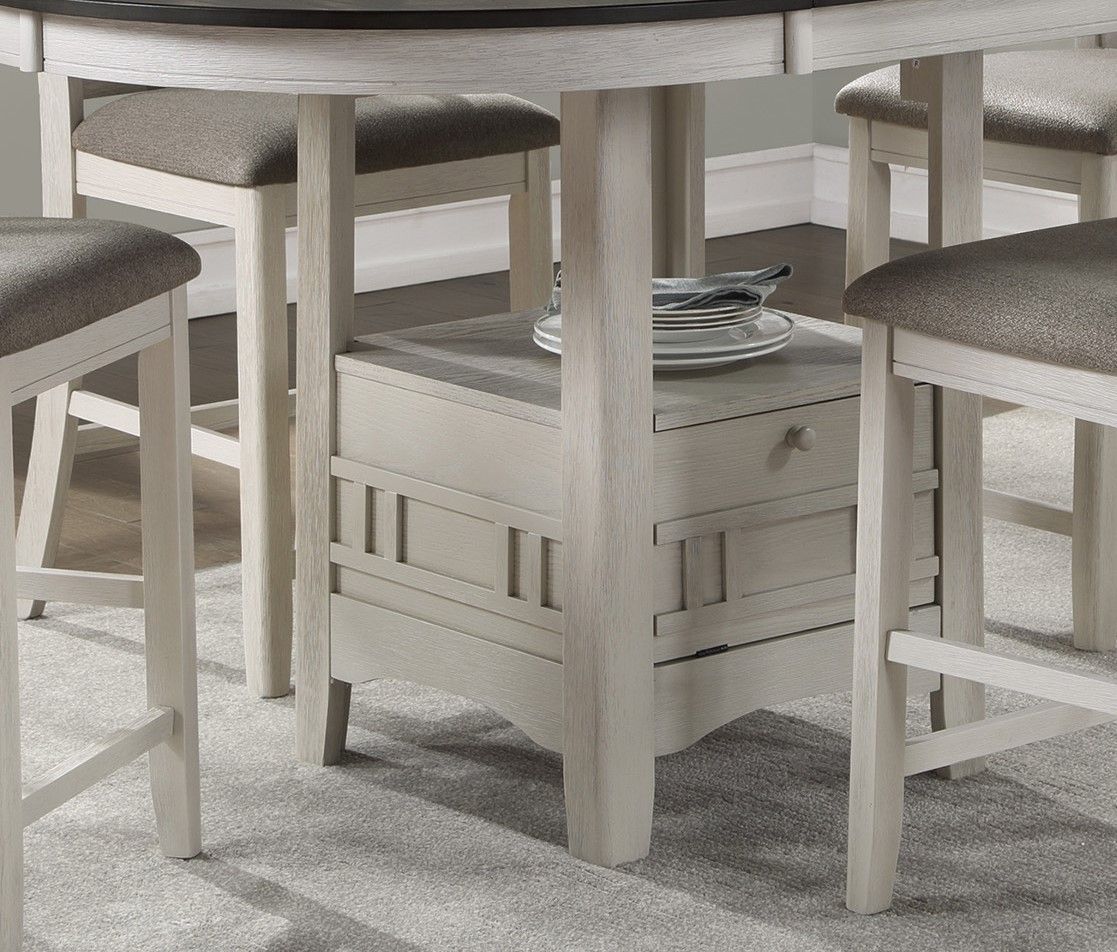 Utilizing the traditional elements of mission styling, this Collection adds the feel of the Arts and Crafts design movement to your casual dining room. The counter height pedestal table base supports an oval top and features storage accessible behind the drop-panel door. Framing, unique to the classic style comprises design of the table base and coordinating counter height chairs. The white finish over oak veneer serves to highlight the woods grain.