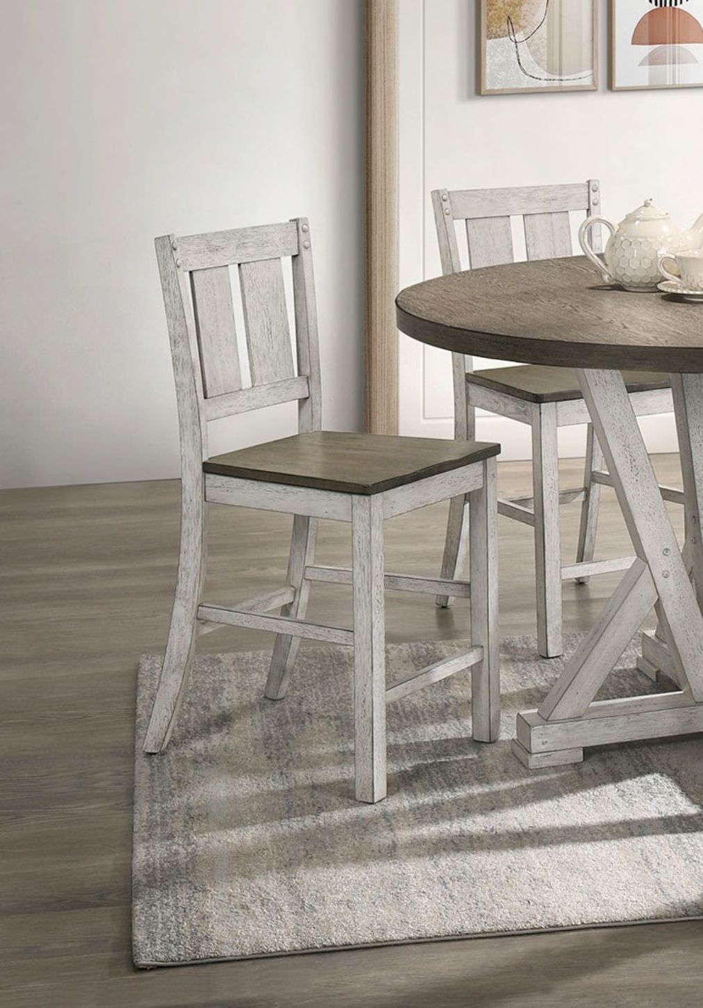 Description - Want a lovely way to start every morning? How about a cozy breakfast on this rustic dinette? The two-tone finish is the star in this ensemble--the table top and seats in warm ash brown color contrasts dramatically with the antique white body frames. They share the same knotty oak veneer that shows multiple dark lines and wood grain, giving the set its natural warmth. Holding up the table top are four bars supported with four legs in a unique pedestal configuration. The diagonal lines create a silhouette that's strictly farmhouse in style..Dimensions -Counter HT. Dining Table - 48"DIA X 36"HDining Chairs - 17 1/2"W X 21"D X 39 3/4"H (SEAT HT: 23 1/4", SEAT DP: 17 3/4")Listing Includes - 5pc Counter Height Dining Set (1x Table And 4x Side Chairs) Only.Features :-RusticAntique White/Ash BrownSolid Wood, Wood Veneer, OthersFarmhouse DesignTwo-toneKnotty Oak VeneerPedestal Base w/ Support LegsWooden Seat