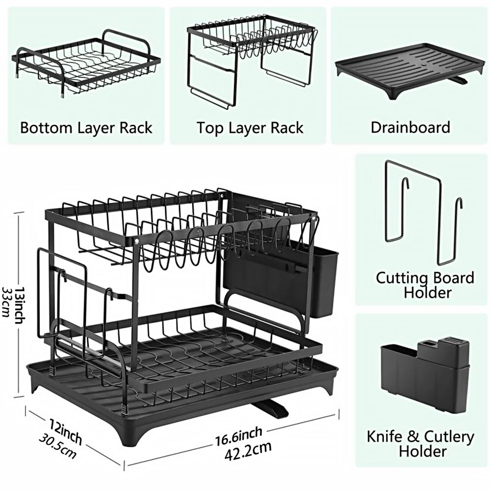 Home > Dish Rack, 2 Tier Utensil Holder, Rustproof Dish Drying Rack with Drainboard and Utensil Holder for Kitchen Countertop, Kitchen Accessories (Black)