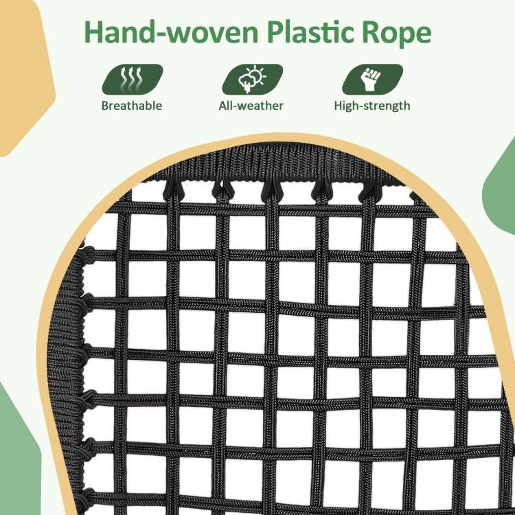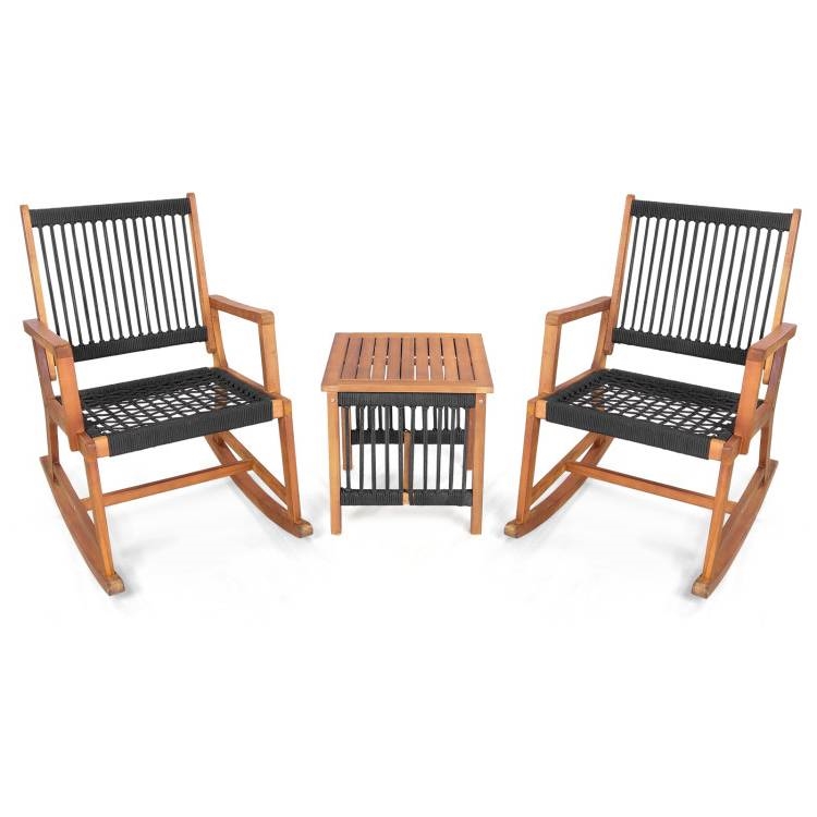 Just sit back and rock the night away! This 3-piece rocking bistro set includes a side table (18" L x 18" W x 18" H) and 2 rockers (33" L x 24" W x 36" H), to create a cozy space for any/all outdoor enjoyment. This rocking bistro set features hand-woven plastic rope, making sure you rock in comfort and style. Come made from solid acacia wood, burr-free surface, and a reinforced crossbar for extra stability.
